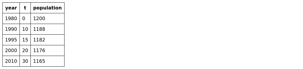 Between1990and 2000, the population of an endangered species decreased at a rate of 0.1% per year. the population P in year t is given by P = 1200(0.9999)^t, where t=0 corresponds to 1980. Find the population of species in 1990, 1995, 2000, and the projected population in 2010.