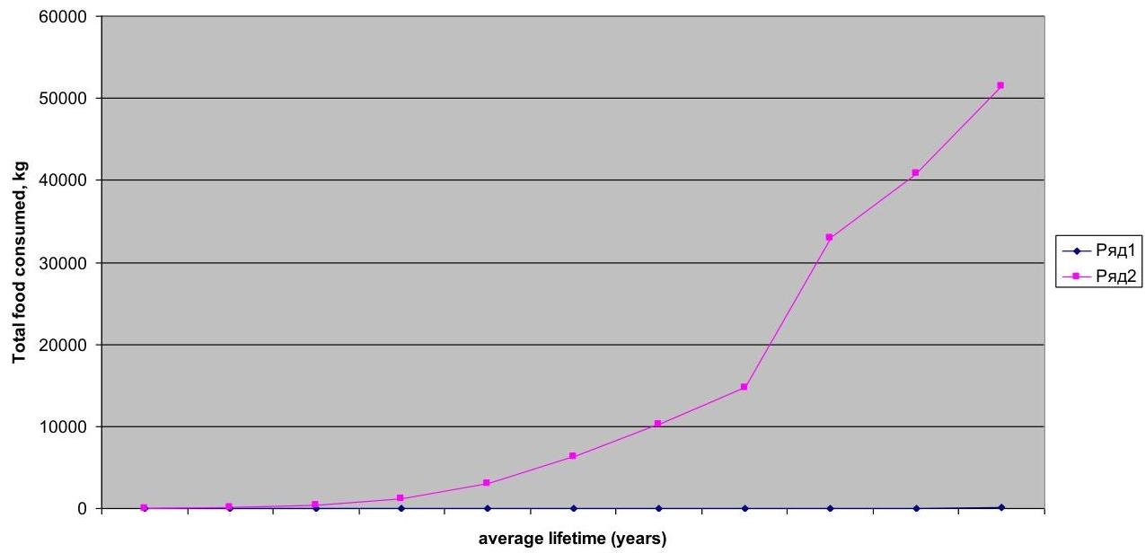 Now multiply each value on 13 kg and we have an amount of food, which is consumed per year, depending of current human age.