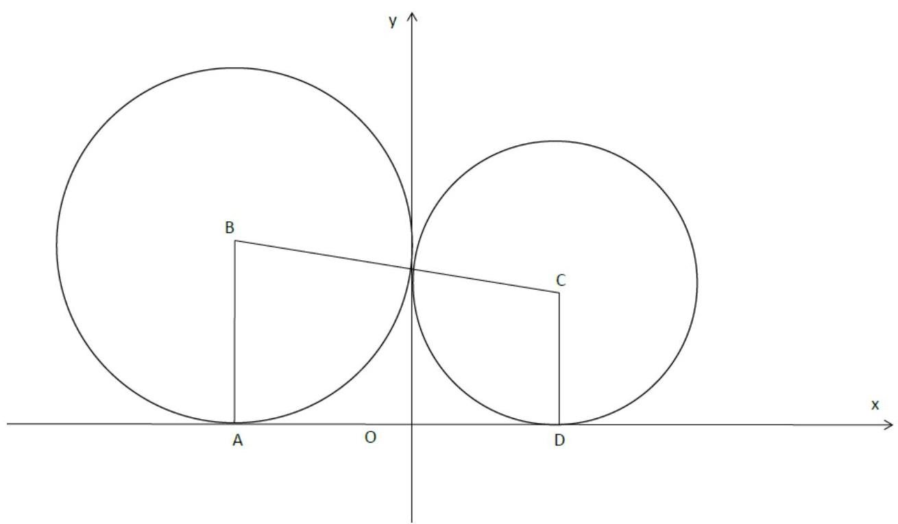 Since -axis is tangent to C1 and C2, and are perpendicular to it as radii of these circles. Since -axis is perpendicular to , then using the previous statement we obtain that is parallel to -axis and is also parallel to -axis. Since -axis is tangent to both C1 and C2, then using previous statement we obtain that is equal to the radius of the circle C1 () and is equal to the radius of the circle C2 (). Thus and we obtain