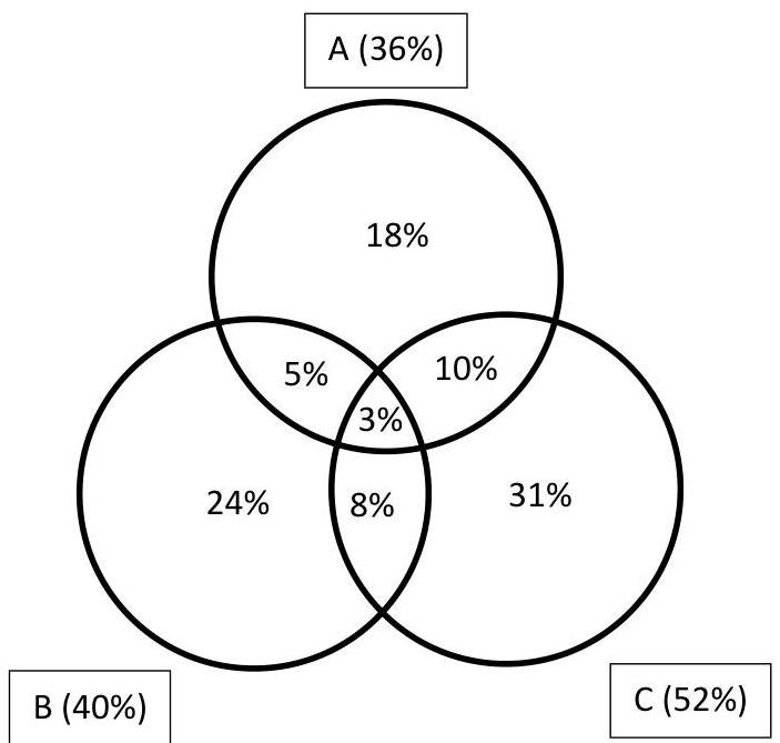 Only C = C - (Only B and C) - (A and B and C) - (Only A and C) = 52% -- 8% -- 3% -- 10% = 31%.