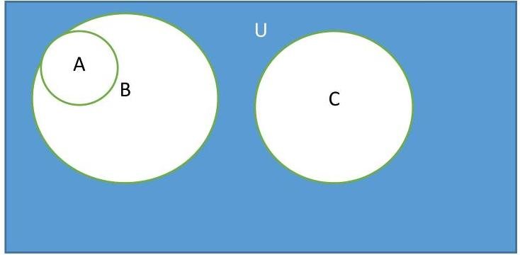 Draw the venn diagram of sets A, B and C where A is contained in (subset equal to) B, A intersection B doesn't equal to phi (empty set), B intersection C = phi (empty set). What is the universal set you have chosen? Justify your choice of sets in the diagram?