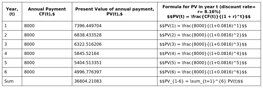 Let's find present value of all cash flows for 6 annual payments. The calculation is shown in table form.