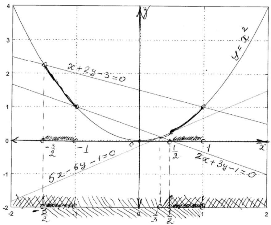Dear samagra. Points inside the triangle lie above the graphs of y=-2x/3+1/3, y=5x/6-1/6 (that is, 2x+3y-1=0, 5x-6y-1=0) and lie below the graph of y=-x/2+3/2 (that is, x+2y-3=0). Algebraically it can be expressed as y>-2x/3+1/3, y>5x/6-1/6, y0, 5x-6y-1