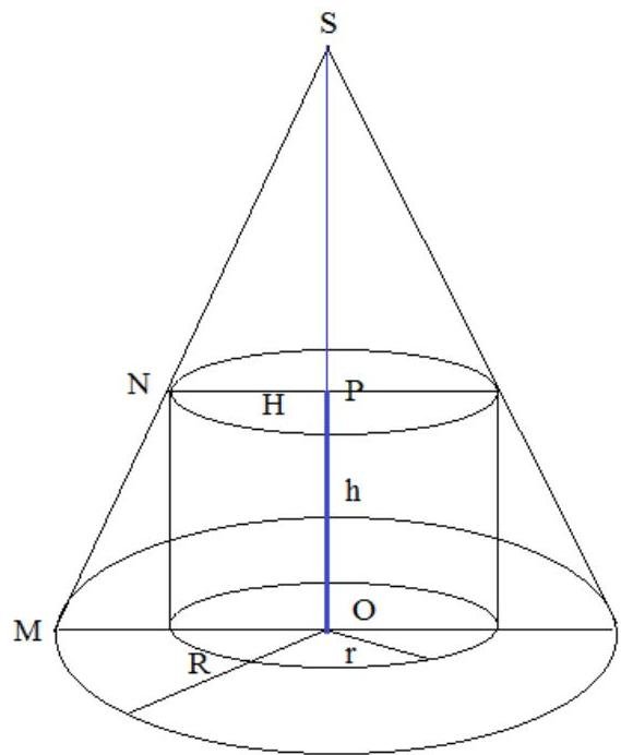 V′′(r)=(πH(2r−R3r2))′=πH(2−R6r);V′′(32R)=πH(2−R6⋅32R)=−4πH<0=> maximum is attained at r=32R, hence Rr=32.V′′(0)=πH>0.r=32R=32⋅12=8,h=H(1−Rr)=H(1−32)=31H=31⋅10=310.