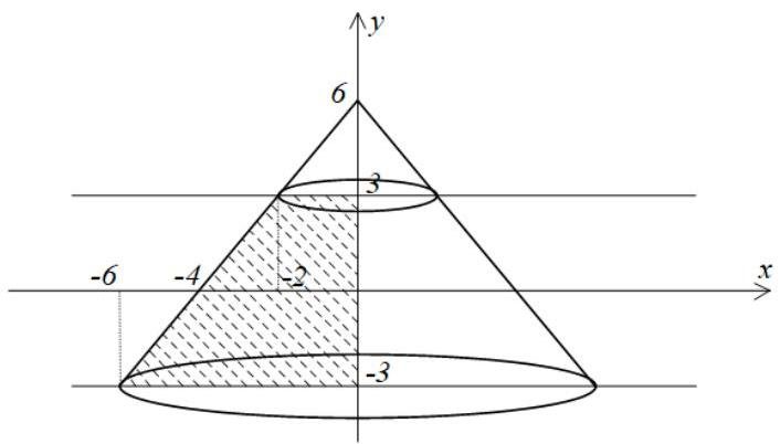 A figure bounded by inequalities is shaded on the picture. After revolving this shape around the y -axis we obtain the frustum of a cone (see picture).