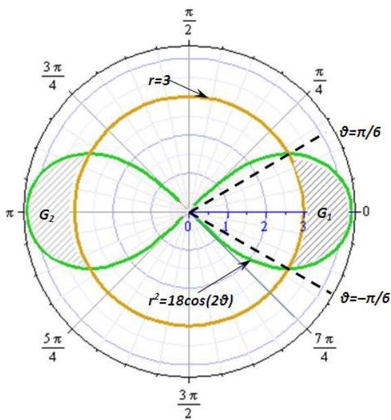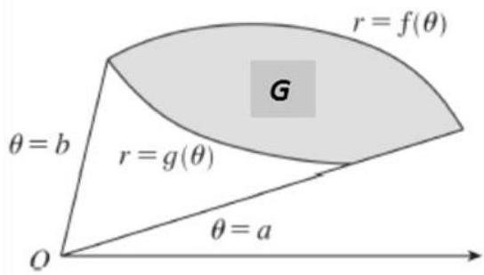 Let G be the region bounded by curves with polar equations r=f(ϑ) and r=g(ϑ) (fig.1), ϑ=a and ϑ=b, where f(ϑ)≥g(ϑ)>0, 0<b−a≤2π. Then area A of G is