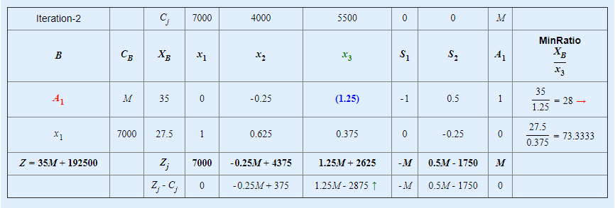 Positive max Zj−Cj is 6M−7000 and its column index is 1. So, the entering variable is w1.Minimum ratio is 27.5 and its row index is 2. So, the leaving basis variable is A2.∴ The pivot element is 4.Entering =w1, Departing =A2, Key Element =4