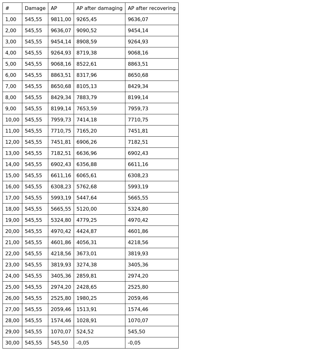 QUESTION : There are 2 units in the first match, Susano-O Gundam and 00-Raiser Gundam. Susano-O has 9811 AP and was defeated after constantly receiving thirty equal damage from Freedom . If Susano-O recovered 4% of its current AP after every damage is taken, find the amount of damage done by Freedom each time .