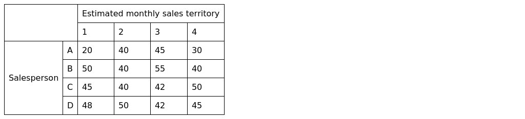 A sales manager wishes to assign four sales territories to four salespersons. The salespersons differ in their ability and skills and consequently the sales expected in each territory are different. The estimates of sales per month for each salesperson in different territories are given below: