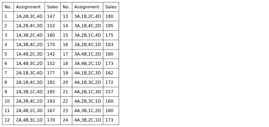Answer: The optimal assignment is 3A,1B,4C,2D; the maximum monthly sales are 195.