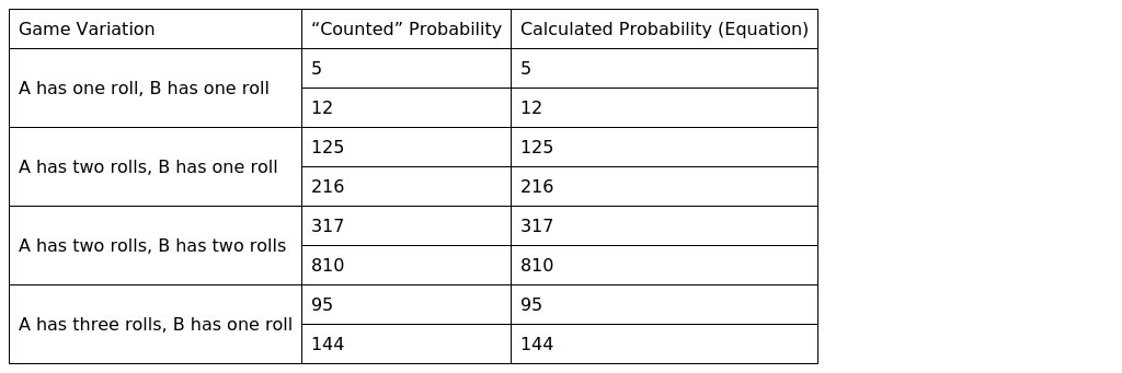 Note that, in order for player A to win by rolling , player B must roll an integer across trials such that . Thus can be expressed as , where and is an integer. The probability that a specific will allow player A to win is therefore ; thus the probability that player A will win is ; note that this equation will only yield correct probabilities in a game consisting two people playing with fair, six-sided dice. To verify this equation, some game variations have been analyzed first by counting the number of outcomes in which player A wins to determine the probability of player A winning in those scenarios. Then, the probabilities of player A winning in each of the game types is calculated using the above formula with the help of script on Microsoft Excel