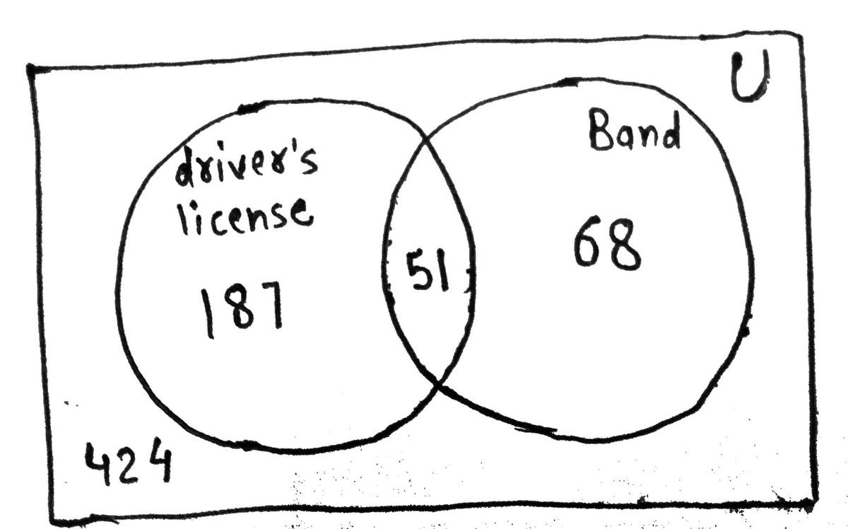 There are 680 female students on the roster at Neil Armstrong High School. Out of these 680 female students, 68 are in the band and 187 have a drivers’ license. 51 female students have a drivers’ license and are in the band.