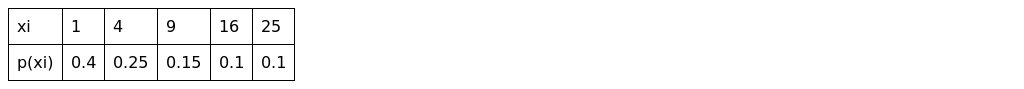 A discrete random variable X has possible values xi=i^2 i=1,2,3,4,5, which occour with probabilities 0.4 0.25 0.15 0.1 and 0.1 respectively