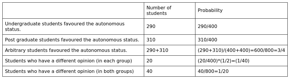 A sample of 400 students of undergraduate and 400 students of post graduate classes were taken to know their opinion about autonomous college. 290 of the undergraduate and 310 of the post graduate students favoured the autonomous status. Present these fact in the form of a table and the test at 5% level, that the opinion regarding autonomous status of colleges are independent of the level of classes of students.