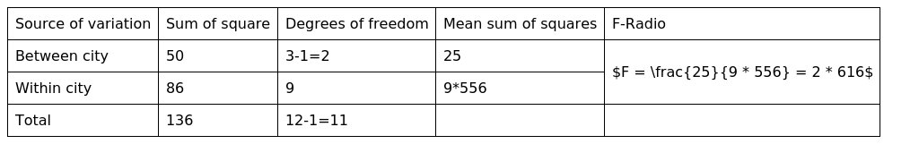 Since the calculated value of F is less than the table value of F the null hypothesis is accepted. We thus conclude that the mean prices in the three cities is not significantly different.