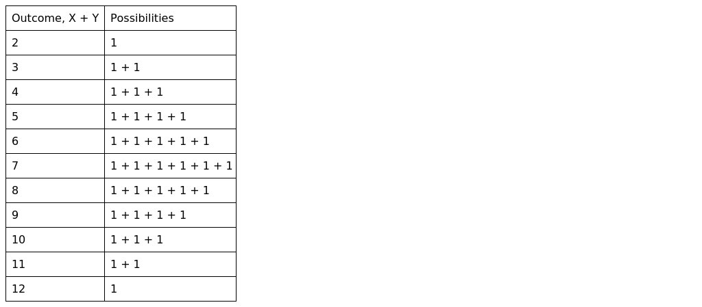 We calculate possibilities of outcome . For value 2 we have one way when and only. For 3 we have two ways and or and .