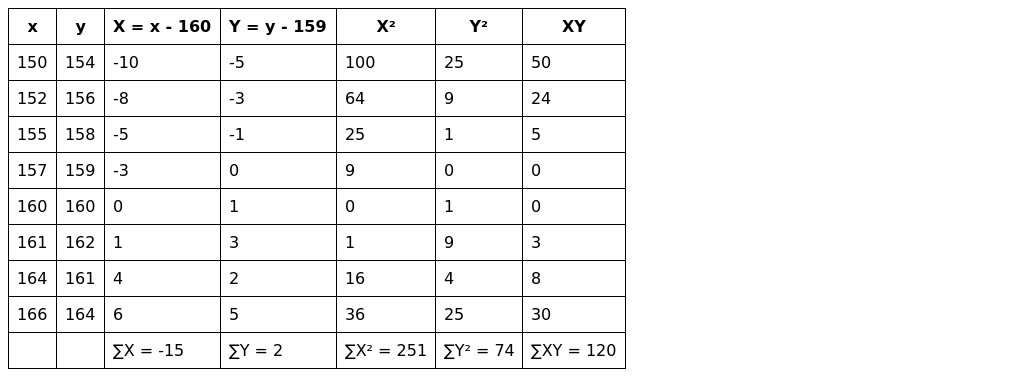 xˉ=160+n∑X=160−815=158.13yˉ=159+n∑Y=159+82=159.25