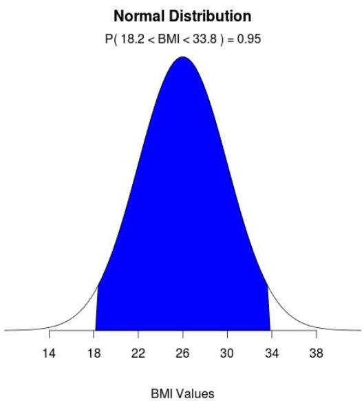 a). To calculate the range of BMI that of subjects fall within we need to determine left and right probability borders centered at mean . The borders will be and and the probability of will be the area under the curve colored in blue (see Fig.1).