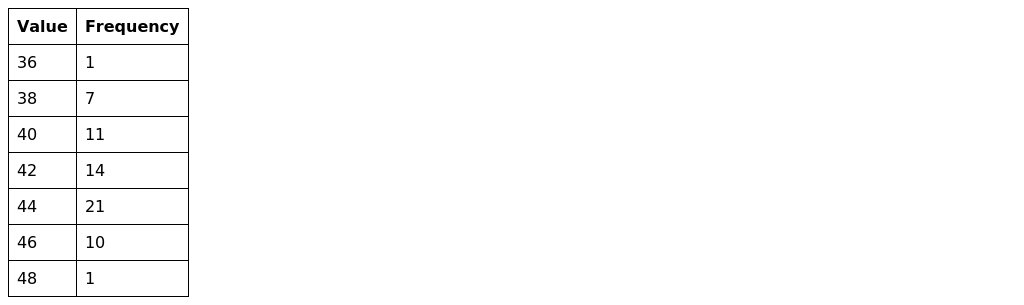 The mean is 43.0, the median is 43.0, the mode is 44.0.