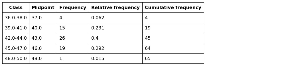 The class with minimum frequency is 48-50, the class with maximum frequency is 42.0-44.0.