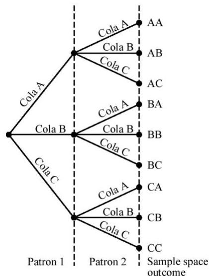 Two randomly selected grocery store patrons are each asked to take a blind taste test and to then state which of three diet colas (marked as A, B, or C) he or she prefers.