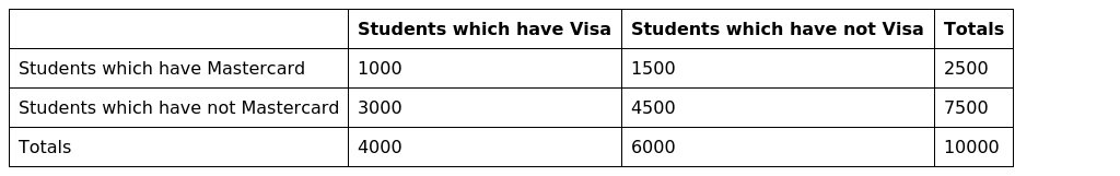 Of 10,000 students at a college, 2,500 have a Mastercard (M), 4,000 have a VISA (V), and 1,000 have both.