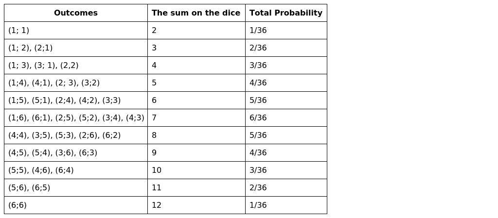Outcomes when rolling two dice: