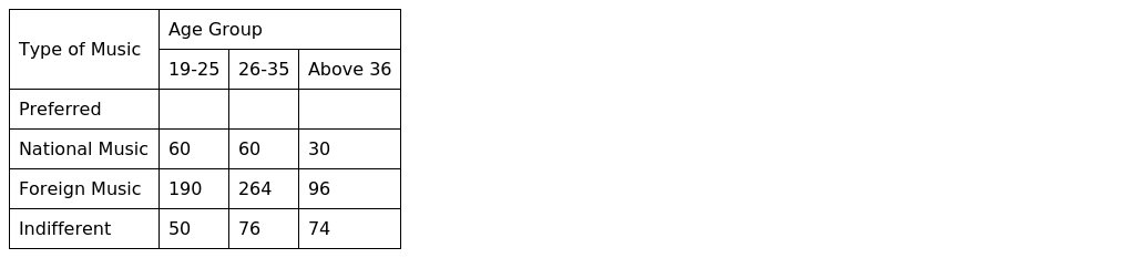 The results of a survey regarding radio listeners preference for different types (5) of music are given in the following table with listeners classified by age group. Test at 5% level of significance whether type of music is dependent on the age group.
