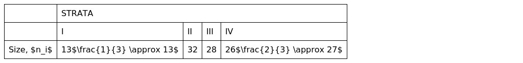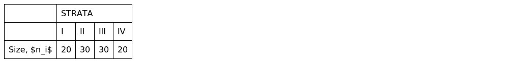 where is the sample size for stratum , is the population size for stratum (, , , ), is total population size, and is total sample size.