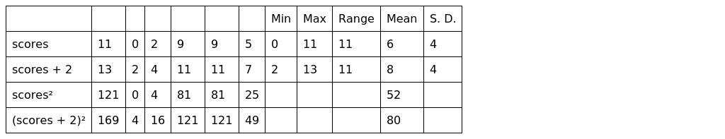 (b) add 2 points to each score and compute the range and standard deviation again. Describe how adding a constant to each score influences measures of variability.