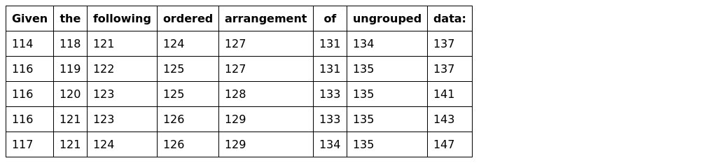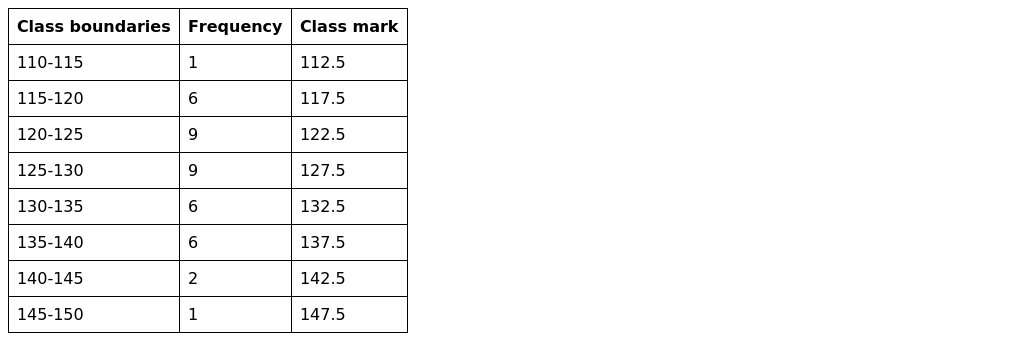 Arrange the data in a frequency distribution having the following columns: Class boundaries, frequency, class mark.