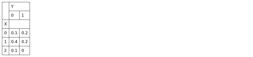 P(Y=0)=P(X=0,Y=0)+P(X=1,Y=0)+P(X=2,Y=0)=0.1+0.4+0.1=0.6P(Y=1)=P(X=0,Y=1)+P(X=1,Y=1)+P(X=2,Y=1)=0.2+0.2+0=0.4
