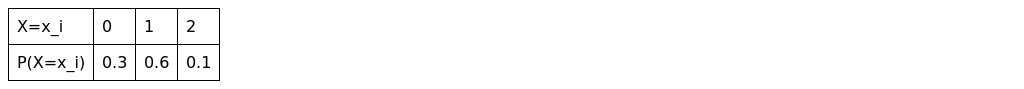 P(X=0)=P(X=0,Y=0)+P(X=0,Y=1)=0.1+0.2=0.3P(X=1)=P(X=1,Y=0)+P(X=1,Y=1)=0.4+0.2=0.6P(X=2)=P(X=2,Y=0)+P(X=2,Y=1)=0.1+0=0.1