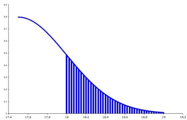 =NORM.DIST(19;17,5;0,5;TRUE)−NORM.DIST(18;17,5;0,5;TRUE)