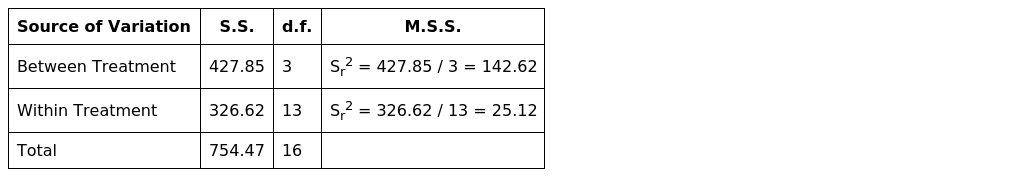 The critical value of F for 3, 13 d.f. and α=0.05 . Thus, H0 is rejected at 5% level of significance.