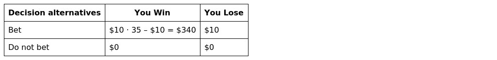 a) Show a payoff table for a $10 bet on one number using decision alternatives of bet and do not bet.