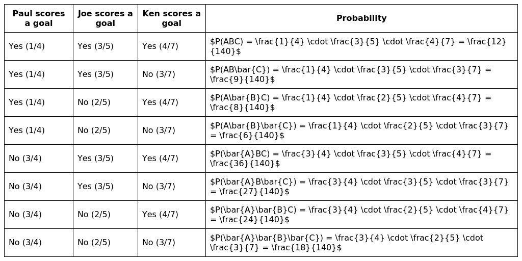 Paul, Joe and Ken are playing soccer. The probability that Paul scores a goal is 41, that of Joe scoring is 3/5 and that Ken scoring a goal is 4/7. Find the probability that in a soccer game: