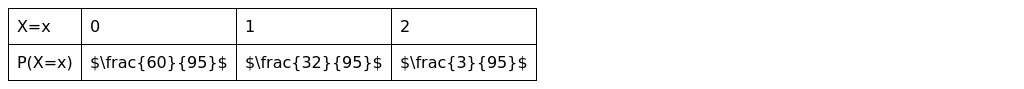 P(X=0)=(220)(216)=2!18!20!2!14!16!=2⋅20⋅1916⋅15⋅2=1912=9560P(X=1)=(220)(14)(116)=2!18!20!1!3!4!⋅1!15!16!=20⋅194⋅16⋅2=9532P(X=2)=(220)(24)=2!18!20!2!2!4!=2⋅20⋅194⋅3⋅2=953Probability distribution