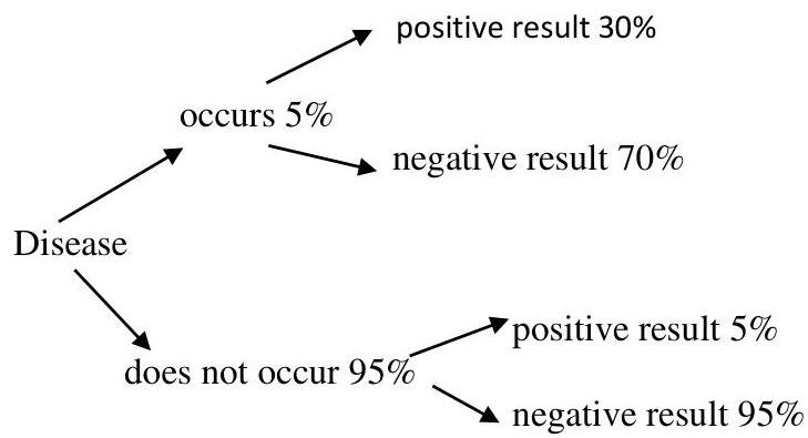 A certain medical disease occurs in 5% of the population. A simple screening procedure is available and in 3 out of 10 cases where the patient has the disease it provides a positive result. If the patient does not have the disease there is still a 0.05 chance that the test will give a positive result. Draw a tree diagram to represent this.