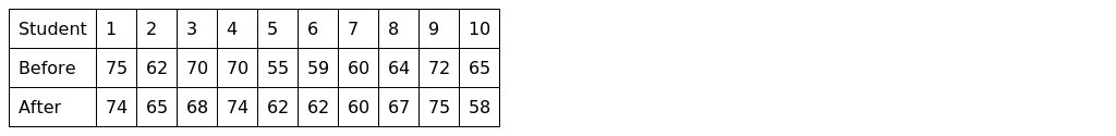 A group of ten students from the course INTE 296 was approached by a famous scientist by the name of Dr. Wild E. Coyote with an experimental drug to aid in their retention of statistical procedures. The drug, called MemoraidTM, was administered after the students completed a generic, comprehensive exam. Twenty-four hours later, the students were given a similar exam, and the test scores were compared. Based on the following table, is there enough evidence to conclude that the drug was effective in increasing their statistical ability? Use an alpha value of 0.05 and find the p-value.
