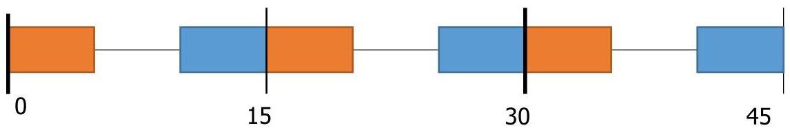 b) Orange regions ([0; 5), [15; 20]) indicate areas that are more than 10 minutes before bus arrival. Their spread is 20-15=5 mins, therefore, the probability in that case is