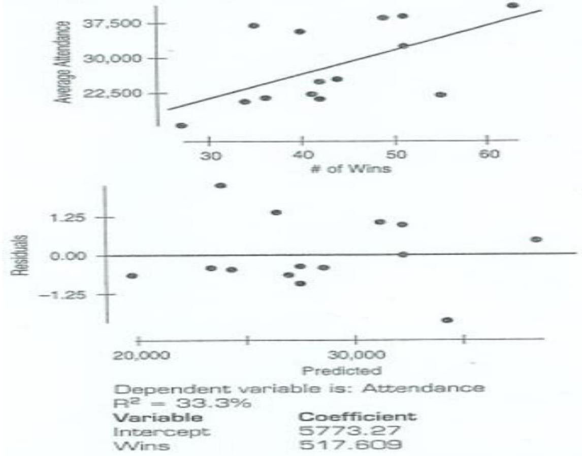 **Baseball.** An exercise in the last chapter looked at the relationship between the number of games won by American League baseball teams and the average attendance at their home games for the first half of the 2001 season. Here are the scatterplot, the residuals plot, and part of the regression analysis.