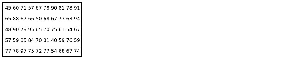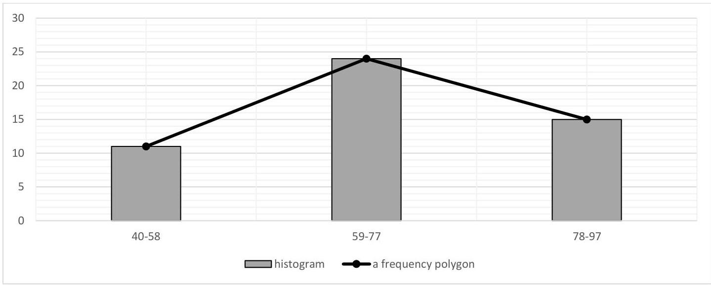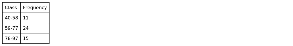 The class width will be . Our classes will be 40-58, 59-77, and 78-97. Then, counting the number of entries in each class, we get