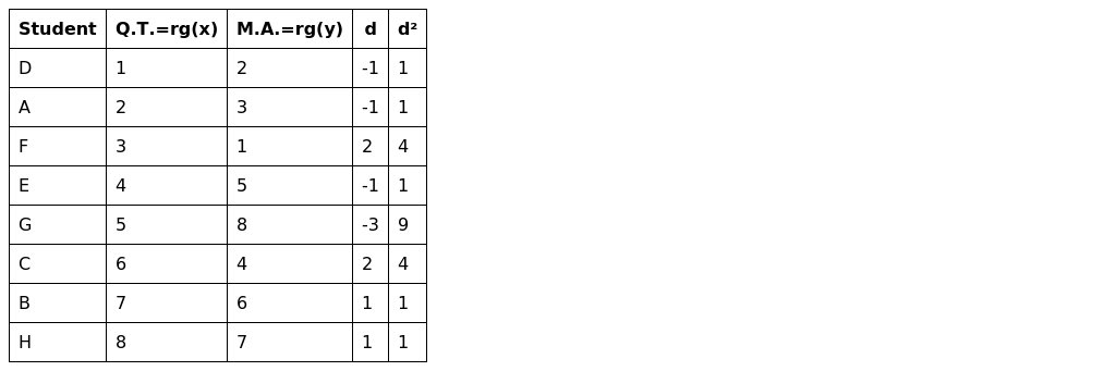 where is the difference between two ranks (measure of order) of each observation, is number of observations. In our case ranks coincide with observations, so we’ll just sort data by Q.T. for clarity. Then we compute and .