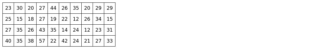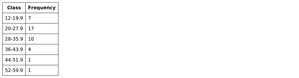 a) Construct a frequency distribution table using eight as the class width and 12 as the lower limit of the first class.