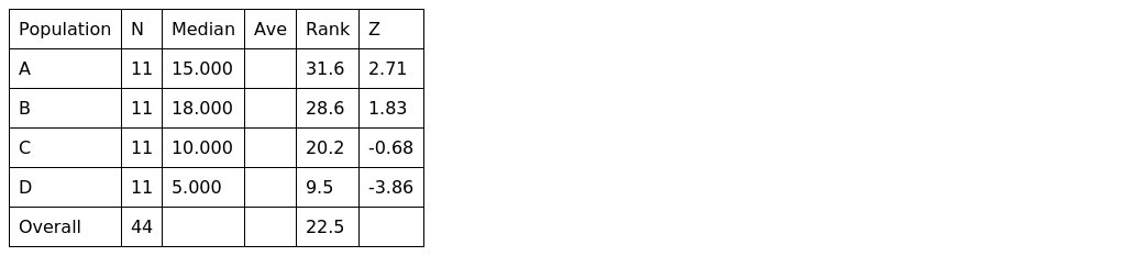 The following table shows the pesticide residue levels (ppb) in blood samples from four populations of human subjects. Use the Kruskal-Wallis test to test at the 0.01 level of significance the null hypothesis that there is no difference among the populations with respect to median level of pesticide residue. Population