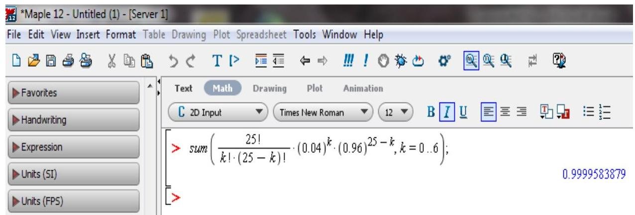 P{6 or less}=P{0}+P{1}+P{2}+P{3}+P{4}+P{5}+P{6}==(025)⋅0.040⋅0.9625+(125)⋅0.041⋅0.9624+(225)⋅0.042⋅0.9623+(325)⋅0.043⋅0.9622++(425)⋅0.044⋅0.9621+(525)⋅0.045⋅0.9620+(625)⋅0.046⋅0.9619==0!⋅25!25!⋅0.040⋅0.9625+1!⋅24!25!⋅0.041⋅0.9624+2!⋅23!25!⋅0.042⋅0.9623+3!⋅22!25!⋅0.043⋅0.9622++4!⋅21!25!⋅0.044⋅0.9621+5!⋅20!25!⋅0.045⋅0.9620+6!⋅19!25!⋅0.046⋅0.9619≈0.99996