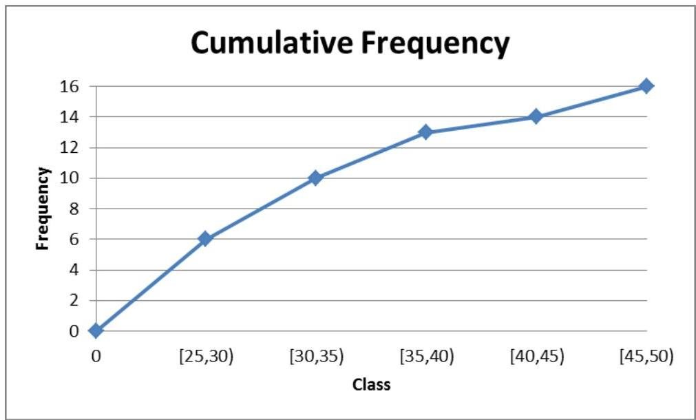 Construct a “less than or equal” ogive for the frequency distribution established in (a) and then approximate the number of candidates who scores below 35.