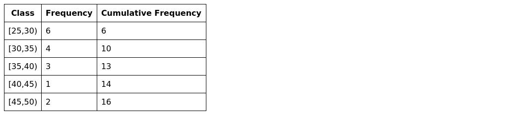 Based on Table 1, organize the data into a frequency distribution by taking 25 as the lowest boundary and 5 as the class width.