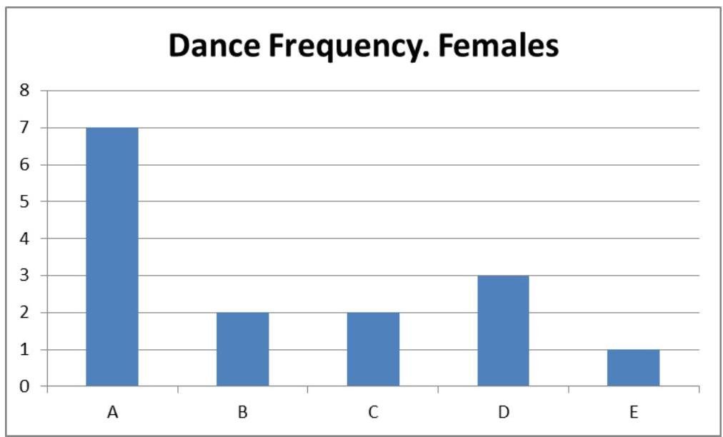 The percentage of the favorite dance (A) is 7 times more than the least favorite dance (E) for females.